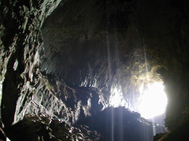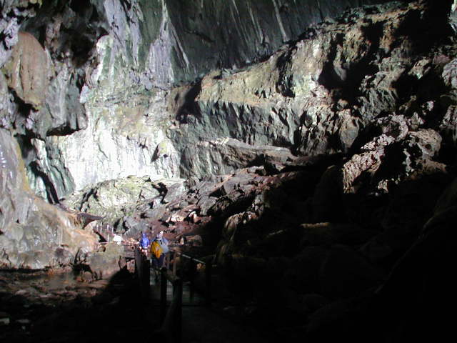 上の写真,左下のほうに青い服を着た人影が写ってる.クリックするとフルサイズの写真になるから,これをみて洞窟全体の大きさを想像してほしいな.あ,説明しておくとこの写真って,洞窟の中を,奥に向かって歩いているところの写真だからね.高い位置に天窓みたいな開口部があるため,昼間の光が漏れてきて洞窟内だけどそれなりに明るい.