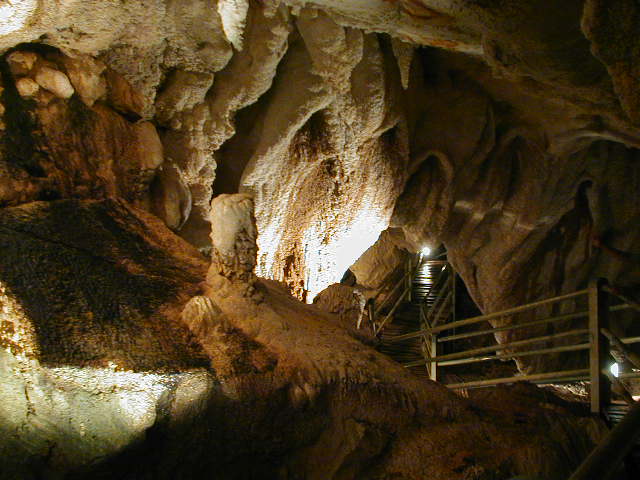 洞窟内の通路が,ラングズ・ケイブでは基本的に一本道の順路を行き来するだけなのだけど,ここでは奥の大きなホールにしたがって中でループしている.天井の高さもみごとで,階段をのぼってホールの天井近くから全体を見下ろすような場所さえある.